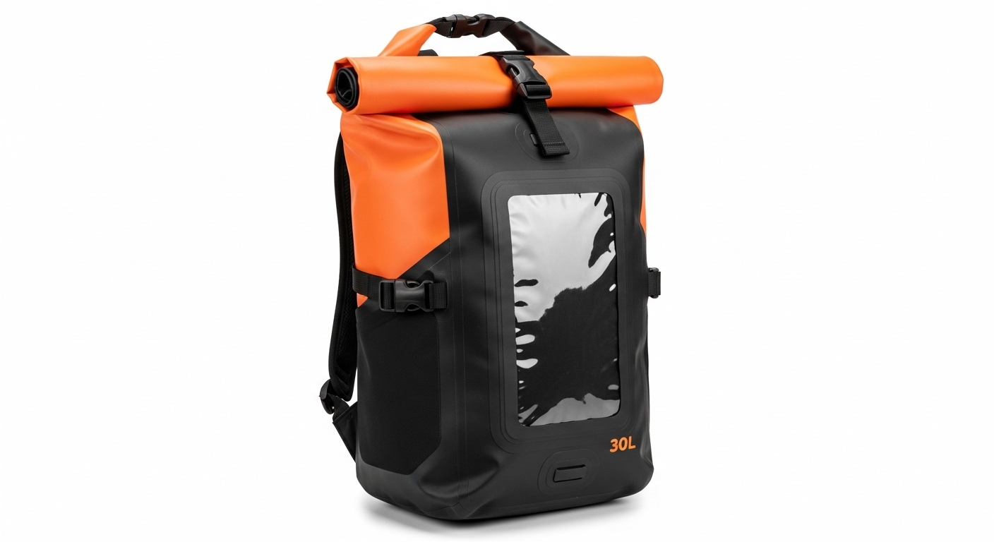 Wasserdichter Roll-Top-Rucksack für Handy, Kamera und Kleidung auf Tauchbooten und beim Shore-Diving. In Kapstadt weht der 'Cape Doctor' — Gischt ist allgegenwärtig. Mit praktischem Sichtfenster.